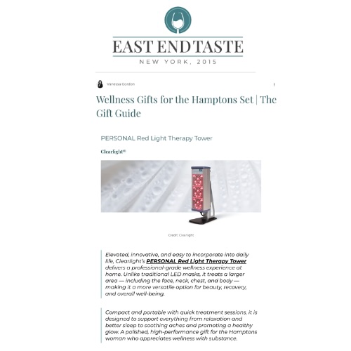 The Clearlight PERSONAL Red Light Therapy Tower is featured in East End Taste’s wellness guide as a leading at-home red light therapy solution. Designed to support muscle recovery, relaxation, and sleep optimization, the device reflects the increasing consumer focus on infrared wellness and daily recovery tools.